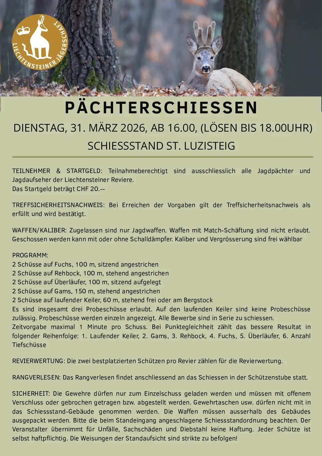 Information zu den Jagdeignungs- und Jagdaufseherprüfungen Im Herbst 2023 werden in Liechtenstein voraussichtlich die Waffenhandhabungs- ...